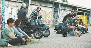 Szene mit Robert Stadlober (links), Claudius Franz (4.v.l.)