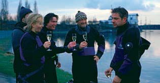 Szene mit Pamela Knaack, Uwe Bohm (3.v.l.), Florian Fitz (1.v.r.)